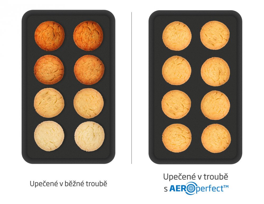 - AeroPerfect™ je kombinace speciálního ventilátoru a upraveného prostoru trouby, které zajišťují rovnoměrné pečení jídla. Rozloží teplo ze všech stran pokrmu bez rozdílů teplot, takže se jídlo v troubě peče všude stejně. Výsledek je bez popraskání, spálení jedné strany či nedopečení druhé a vypadá i chutná perfektně. A navíc trouba peče úsporněji, takže šetří i náklady na elektřinu.