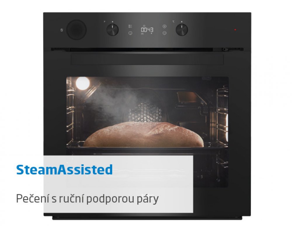 - SteamAssisted je pečení s podporou páry, kterou lze přidat během programu ručně. Je pohodlnější alternativou vkládání nádoby s vodou, protože není nutné otevírat dvířka trouby a stačí jen zamáčknout zásobník s vodou. Tím se v troubě udrží stálá teplota, zvýší vlhkost a upečené jídlo bude šťavnatější a nadýchanější.