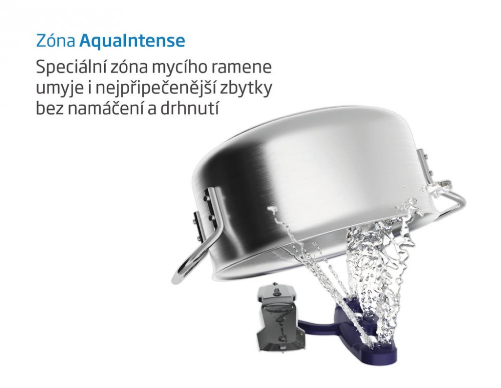 Umyje i připečené zbytky bez drhnutí - Přídavné rameno AquaIntense® je součástí spodního mycího ramene. Je vybavené tryskami s vysokým tlakem vody, které se spustí přidáním funkce AquaIntense k programu Eco nebo Intensive. Pohyb a vysoký tlak vody zvládnou dobře odstranit i připečené zbytky v pekáči a zaschlé jídlo na stěnách hrnce. Bez předmývaní, bez drhnutí.