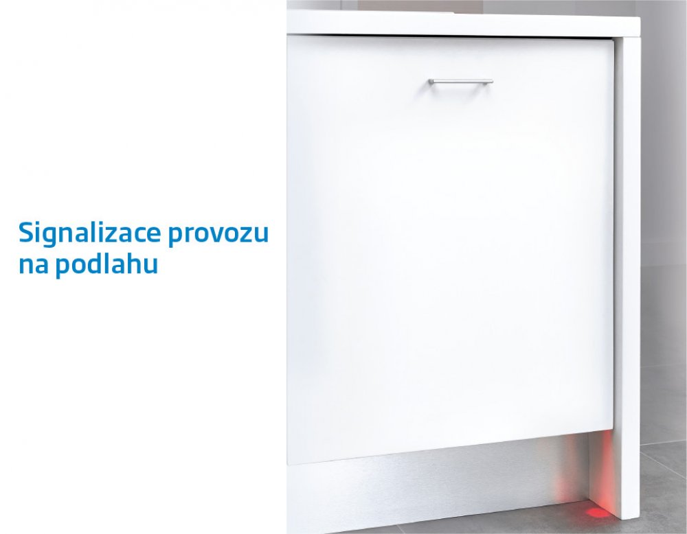 O provozu vás informuje LED signalizace na podlahu a senzor čistoty vody neustále kontroluje kvalitu a přizpůsobuje délku i intenzitu cyklu. O vaši bezpečnost se stará Aquasafe+ (AquaStop), který zabrání nechtěnému úniku vody.