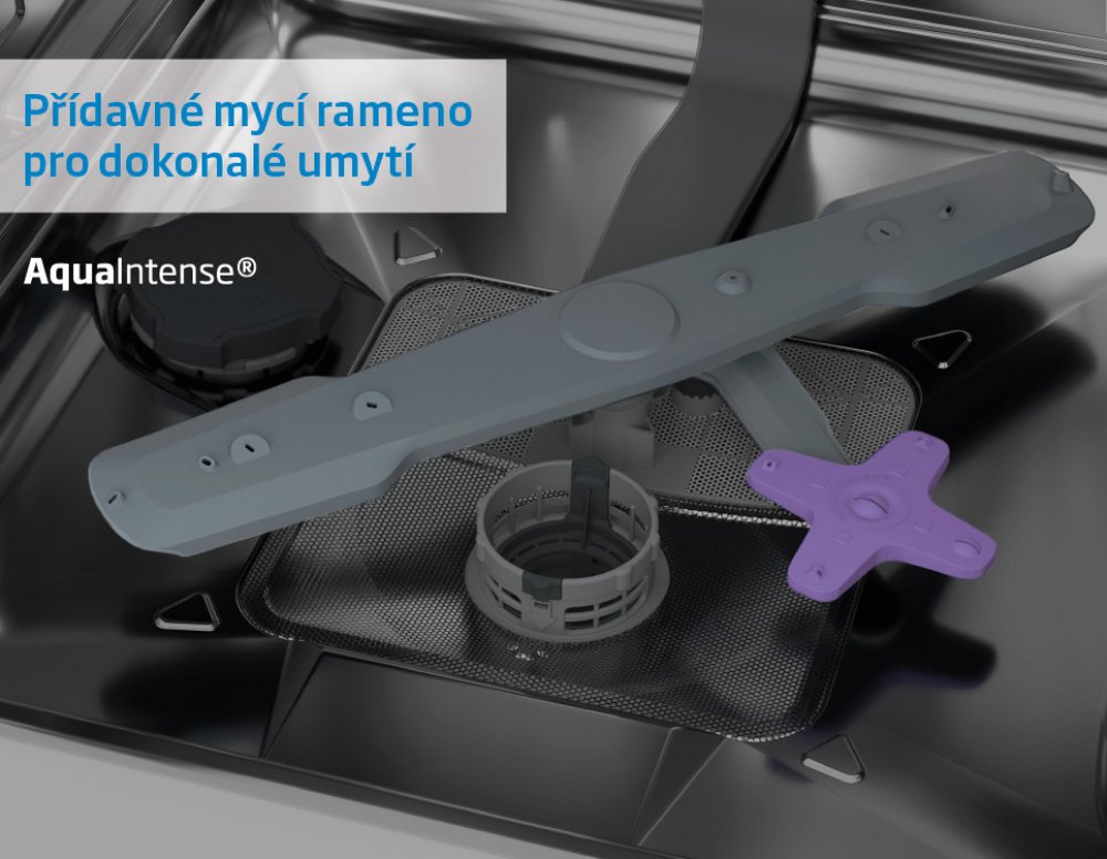 AquaIntense® je součástí spodního mycího ramene. Je vybavené dalšími tryskami, ale s vyšším tlakem vody. Díky nim dokáže dobře odstranit i připečené zbytky v pekáči a zaschlé jídlo na stěnách hrnce. Bez předmývaní, bez drhnutí.