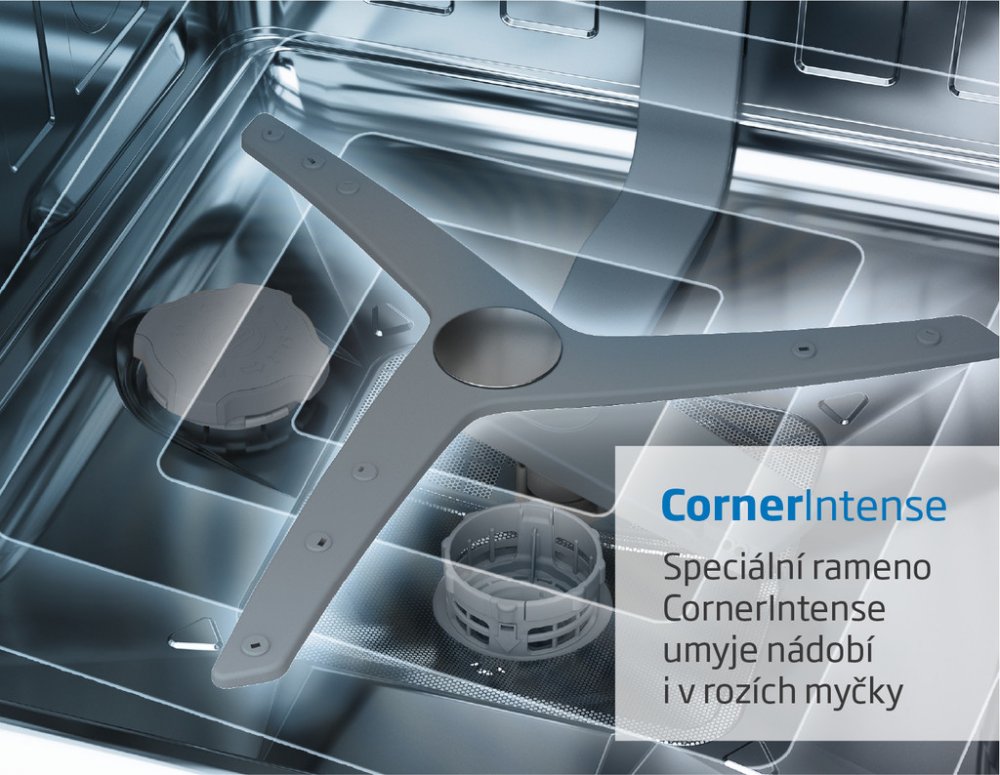 Výškově nastavitelný horní koš Acrobat se 3 polohami, Příborová přihrádka, Samonastavovací panty na dveře o hmotnosti 3,5-6,5 kg, LED signalizace provozu na podlahu, Senzor čistoty vody, Aquasafe+ (AquaStop)