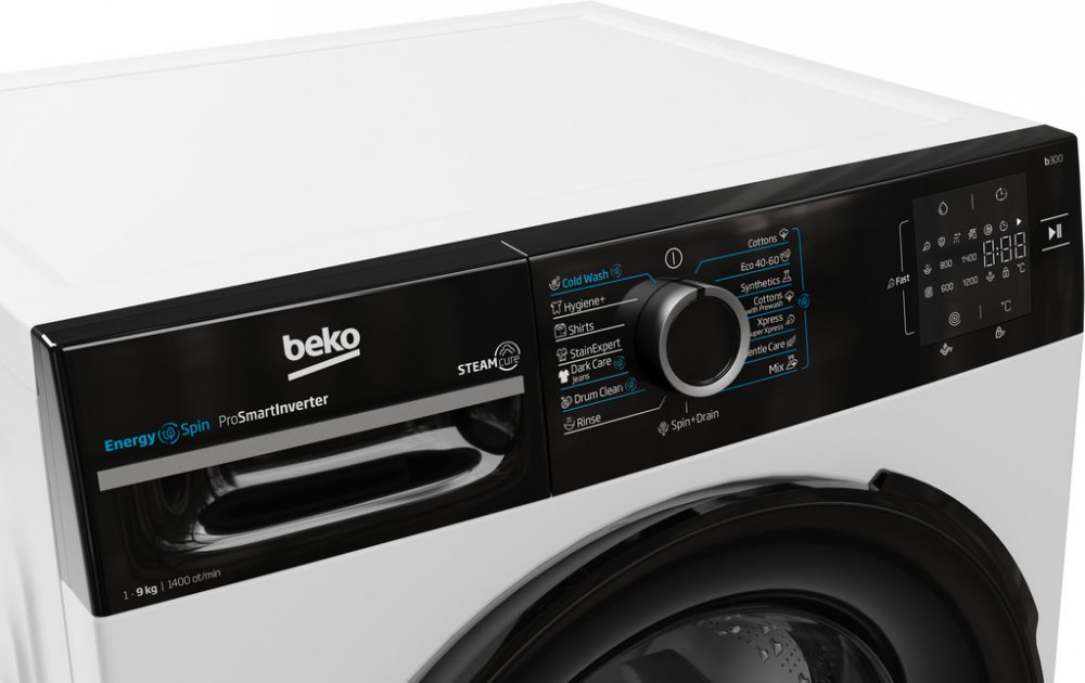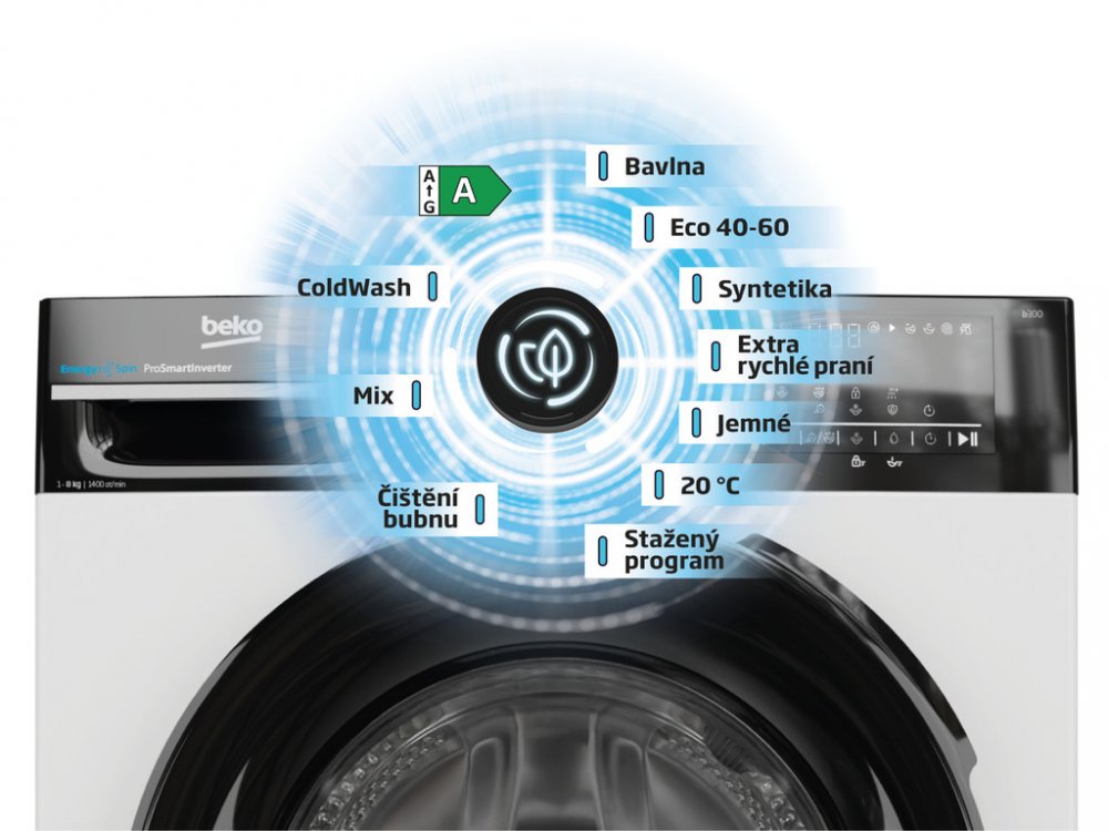 Pračka s kapacitou 9 kg, max. otáčky 1400 ot/min, energetická třída A, EnergySpin, Pára SteamCure, Program XpressSuperShort/ Mini14, ProSmart Invertorový motor, AquaWave buben