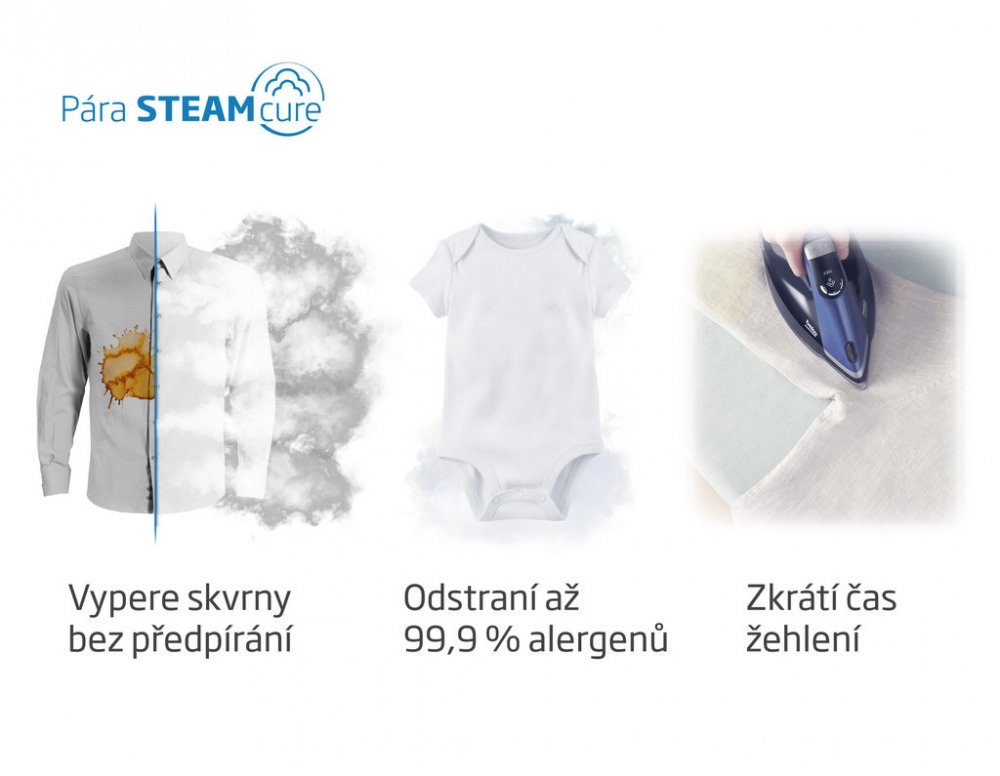 Pára SteamCure pomáhá v průběhu cyklu odstranění odolných skvrn tím, že pronikne hluboko do tkaniny, skrvny odmočí a umožní jejich vyprání. Během odstředění zase zabraňuje pomačkání prádla, čímž usnadní žehlení, dokáže odstranit až 99,9 % alergenů včetně bakterií a virů a umí také osvěžit jinak čisté prádlo bez nutnosti praní.