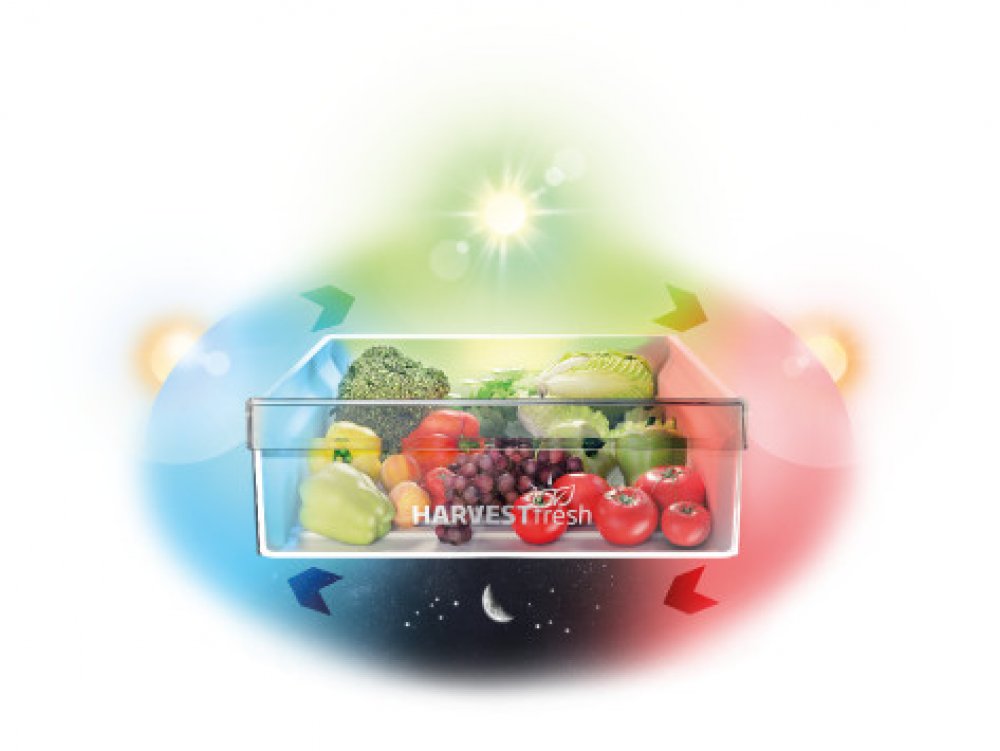 Svetelny rezim prihradky HarvestFresh™ kopiruje stridani slunecniho svetla a tmy behem celeho dne. To udrzi v chodu prirozene procesy v ovoci a zelenine, takze se uchova vice vitaminu i chuti, nezkdyby byly jen zavrene ve tme. Uskladnene ovoce a zelenina tak brzy nevadne, nezkazi se drive, nezse sni, a ulehci caste nakupovani.