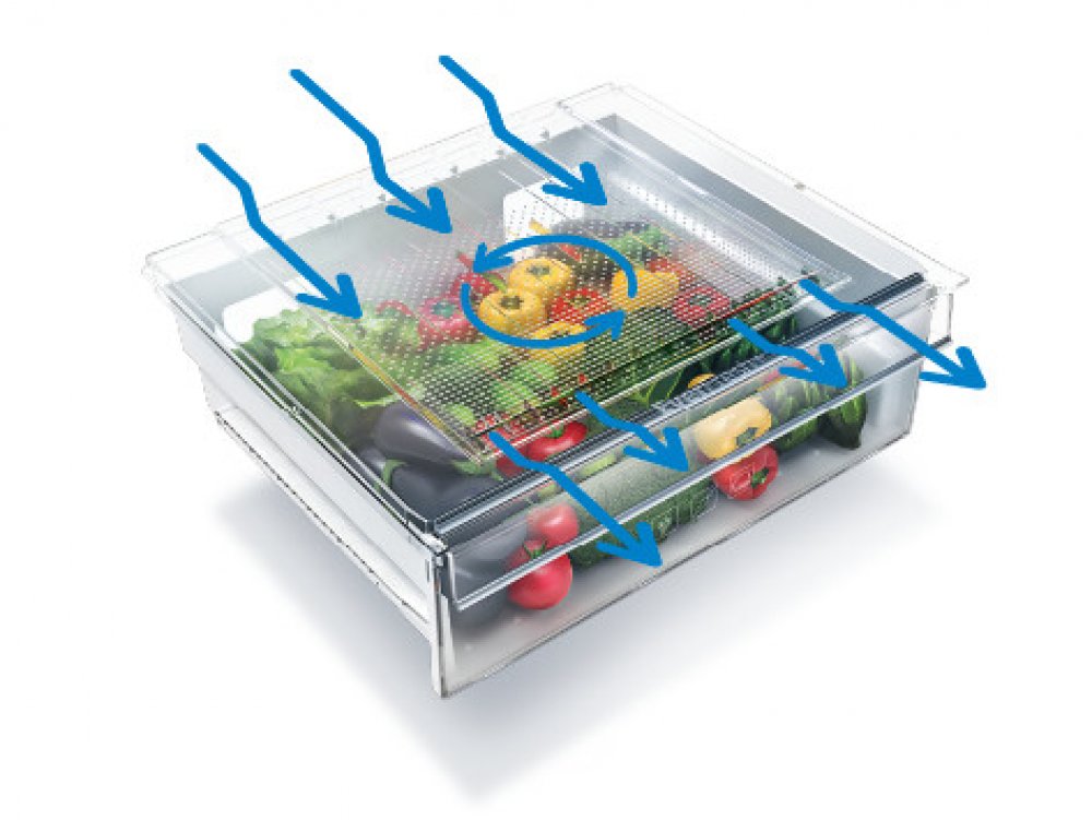Ovoce a zeleniny vadne rychleji, pokud je v prostredi, kde se meni teplota a vlhkost. Prihradka EverFresh+® ma proto specialni cirkulaci vzduchu, ktera uvnitr udrzuje stalou vyssi vlhkost a nizsi teplotu. Ovoce a zelenina tak zustavaji dele cerstve, stavnate a krupave.