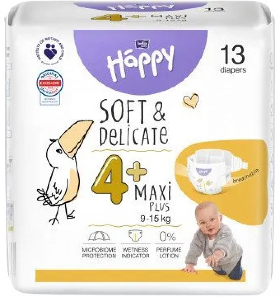 Dětské pleny Happy Soft & Delicate Maxi Plus (4+) jsou doporučeny pro novorozence s hmotností 9-15 kg. Jsou vyrobeny z nejkvalitnějších materiálů, dokonale se přizpůsobí tělu dítěte a poskytují příjemný pocit sucha. Jsou navrženy tak, aby vyhovovaly potřebám té nejcitlivější pokožky – neobsahují žádné alergeny a minimalizují riziko vzniku opruzenin.