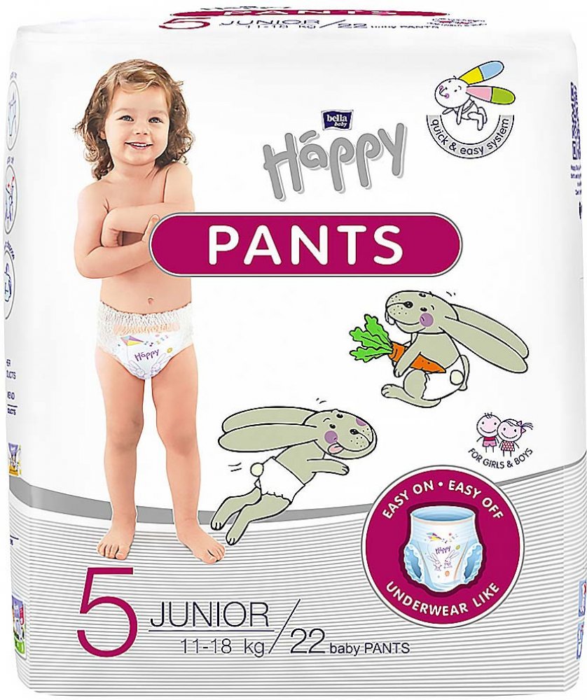 Natahovací plenkové kalhotky Bella Happy Pants Junior jsou určeny dětem o hmotnosti 11 – 18 kg a jsou novinkou v sortimentu značky Bella Baby Happy. Batole toho umí čím dál tím víc a pomalu se učí nezávislosti v každodenním životě. Většinu času tráví hraním a objevováním světa kolem sebe. Dítě v této vývojové fázi je velmi aktivní a živé a někdy i netrpělivé. Natahovací plenkové kalhotky Happy Pants představují ideální řešení rychlého a jednoduchého přebalení dítěte. Díky konstrukčnímu systému Quick & Easy vypadají jako spodní prádlo a je velmi snadné je obléknout, ale i rychle svléknout a to pouhým roztržením bočního švu. Flexibilní pásek kolem pasu umožňuje dokonalé uchycení v každé pozici, postranní volánky kolem nožiček jsou pružné a extrémně měkké a proto kalhotky správně sedí a nikde netlačí a děti ani nevědí, že je mají. Jejich zadeček je v suchu, protože speciální netkaná textilie Quick Dry urychluje distribuci vlhkosti po celé délce plenkových kalhotek. Kalhotky Happy Pants jsou prodyšné a umožňují pokožce děťátka dýchat. Tím zabraňují vzniku opruzenin a minimalizují riziko podráždění pokožky. V každém balení jsou kalhotky se 2 odlišnými motivy potisku veselých zvířátek. Plenkové kalhotky Happy Pants nejsou parfemovány, neobsahují chlór ani latex a jsou dermatologicky testovány. Plenkové kalhotky Happy Pants umožňují vašemu dítěti být HAPPY.