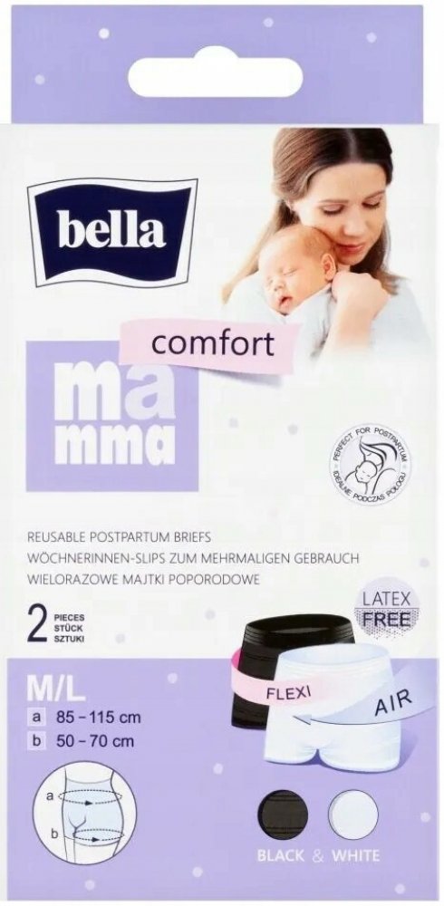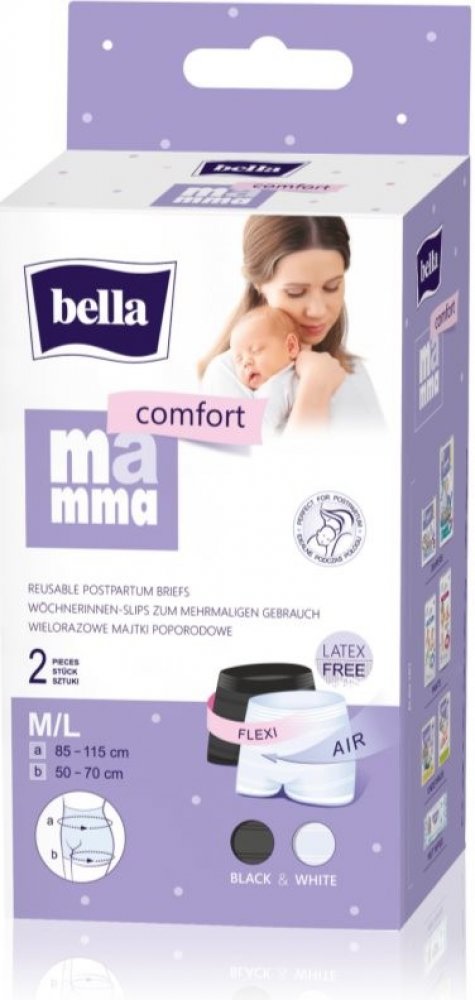 Poporodní kalhotky Bella Mamma Comfort pro opakované použití pro maminky po porodu. Jsou alternativou k běžným síťovaným kalhotkám, více připomínají spodní prádlo. Jsou pratelné, prodyšné, esteticky provedené, dokonale přiléhající k tělu. Udržují poporodní vložku na místě, přizpůsobují se tvaru těla a nikde netlačí. Neomezují proudění vzduchu, což je důležité pro rychlé hojení poporodních ran. Každé balení obsahuje 2 ks kalhotek ve dvou barvách – bílé a černé pro lepší kombinaci s oblečením. Vlastnosti poporodních kalhotek: alternativa běžných síťovaných kalhotek pratelné pro opakované použití neomezují proudění vzduchu 2 ks ve dvou barvách (bílé a černé) neobsahují latex