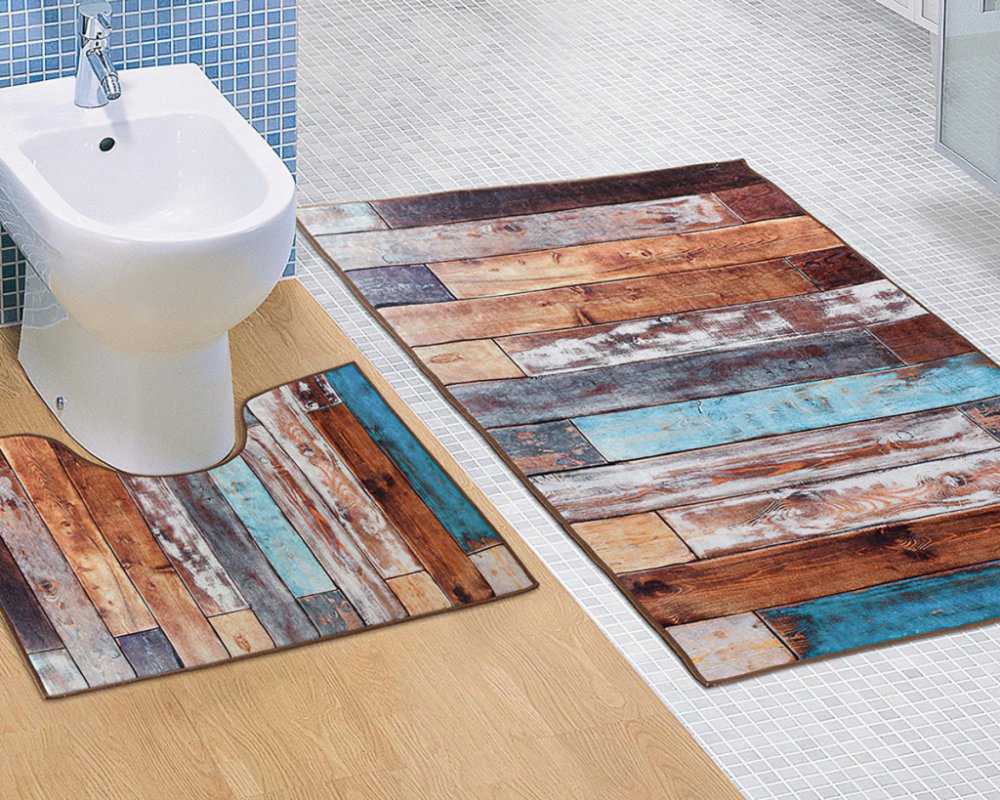 Koupelnové předložky 3D tisk, sada 1+1 s výřezem pro WC. Luxusní koupelnový doplněk s latexovým povrchem, který neklouže a příjemně zahřeje studené nožky. Výška vlasu 0,5 cm | 100 % Polypropylen.