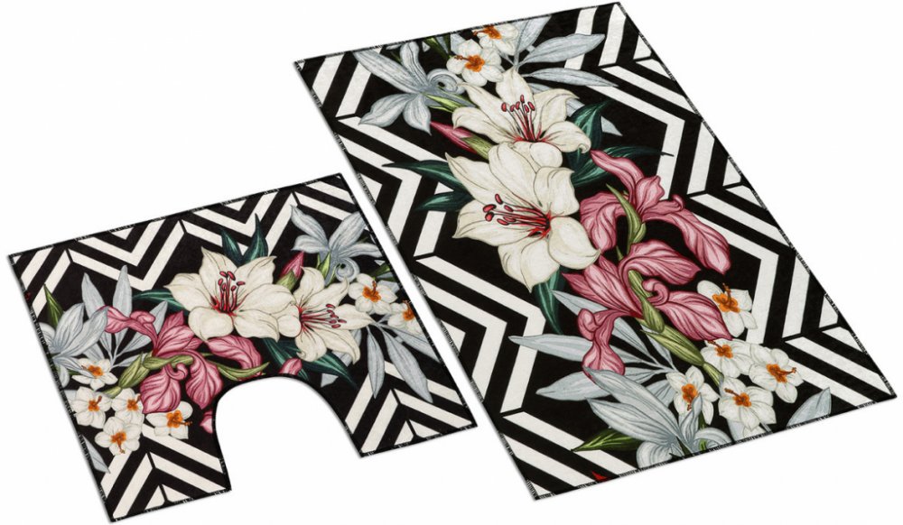 Koupelnové předložky s 3D fototiskovým se vzorem lilie s černo-bílými proužky, zaujmou svým realistickým vzhledem, věrnými barvami i nezvykle příjemným pocitem na dotek. Jsou vyrobeny ze 100% polypropylenu. Latexový nátěr na rubu předložky vytváří protiskluzový povrch, takže Vám nehrozí uklouznutí na mokré podlaze. Souprava se skládá z předložky do koupelny 100 x 60 cm a předložky před WC 60 x 50 ...