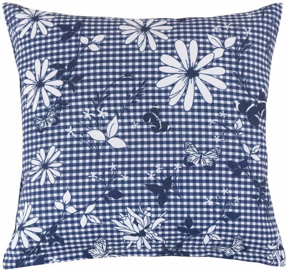 Dekorační polštářek s motivem bílého květu na modré kostičce. Polštářek je z obou stran stejný. Povlak na polštářek je vyroben z 90% bavlny a 10% polyesteru a výplň je tvořena ze 100% Polyesteru (kuličky z dutého vlákna). Vnitřní výplň je možné vyjmout a prát povlak samostatně.