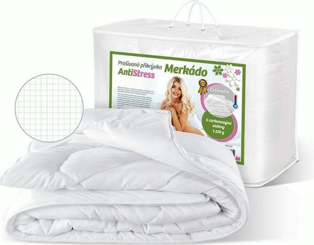Přikrývka je balena do firemní přepravní tašky | Značka – Bellatex | výrobce - Bellatex s.r.o. | vyrobeno v České republice | celoroční přikrývka Merkado Anti Stress, ID produktu 8650/1320 | gramáž - 1320 g/m2 |povlak - 100% Polyester a karbonová vlákna | výplň – 100% Polyester dutinové komorové vlákno | doprava pouze PPL.