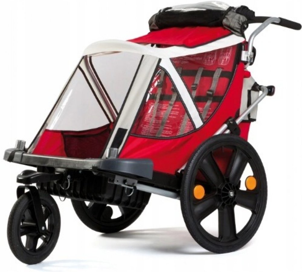 Další parametry: B-TRAVEL Dětský vozík za kolo je vybaven 20“ koly s rychloupínacím systémem; vícevrstvou zástěnou: sluneční stříškou, ochrannou sítí a průhledným nepromokavým krytem