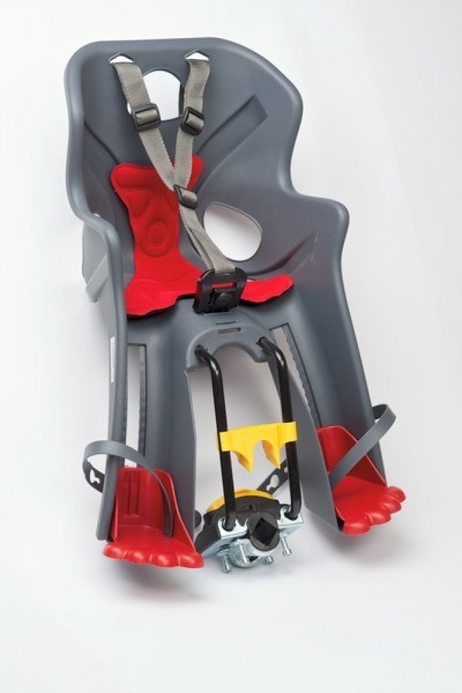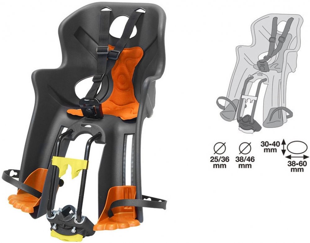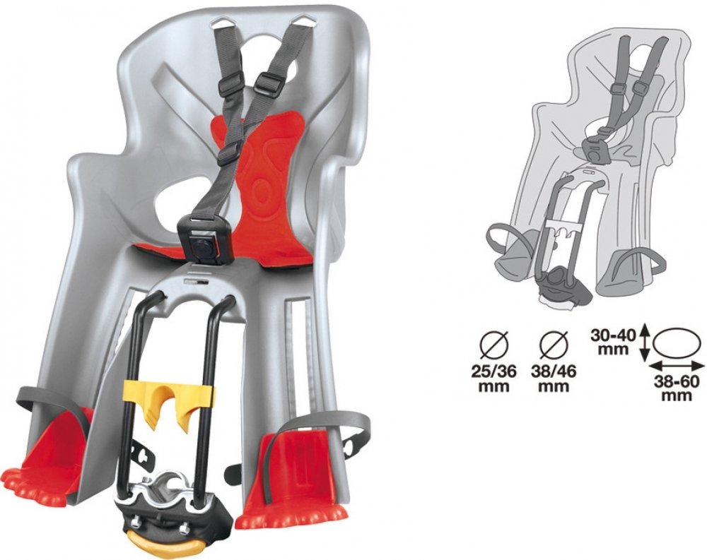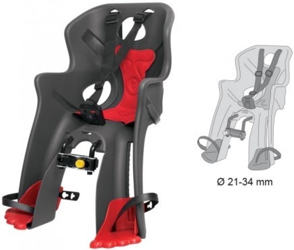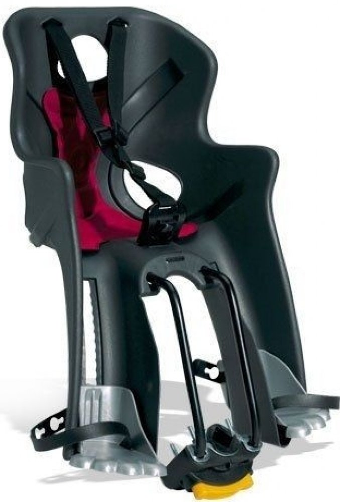 - Upevnění na kolo: držák na spodní (šikmou) rámovou trubku, který umožňuje velmi rychlou montáž a demontáž sedačky na rám kola.