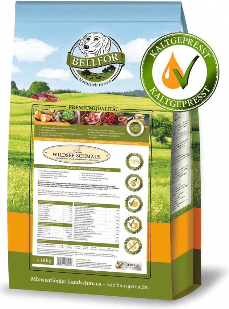 Bellfor Wildsee-Schmaus obsahuje jako jediný zdroj živočišných bílkovin potravinářské kachní maso. Kromě sušené kachny používáme i čerstvé maso, které přidáváme do krmiva těsně před koncem výroby.