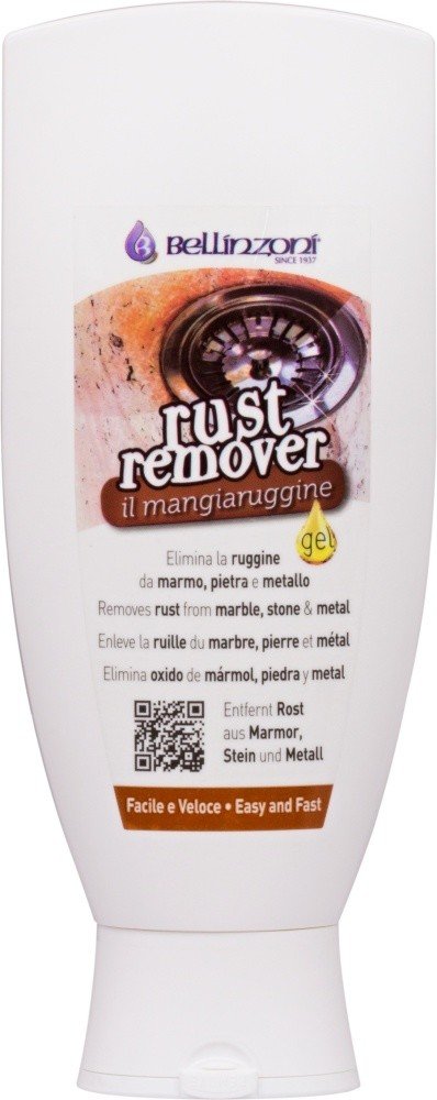 RUST REMOVER MangiaRuggine" Rez Jedlík" je gel, zvláště vyvinutý pro odstranění skvrn od rzi na všech materiálech. Může být bezpečně používán i na leštěné mramory, bez poškození lesku. MANGIARUGGINE gel působí rychle a odstraní rez bez námahy. BELLINZONI RUST REMOVER odstraňovač rzi prostředek je silný, je šetrný k povrchu a nepoškozuje přirozenou strukturu ani lesk kamene. Nepřekračujte zbytečně dobu po kterou je přípravek nanesen došlo by ke zbarvení materiálu. Pokud je to možné použijte pro odsátí vody při výplachu stavební vysavač. POUŽITÍ NA: Mramor, žula, terakota, porfyry, cement, břidlice, beton, keramika, glazované dlažby. MOŽNÉ POUŽÍVAT I NA LEŠTĚNÉ MATERIÁLY – NENIČÍ LESK NÁVOD K POUŽITÍ:-Používejte na suchý povrch, špachtlí natřete skvrnu cca 5mm vysokou vrstvou odrezovače,jakmile gel změní barvu do RŮŽOVA, okamžitě vypláchněte proudem vody. DŮLEŽITÉ!!! Nenechávejte působit déle než 10 min., aby nedošlo k proniknutí gelu do čištěného materiálu .V případě potřeby, postup opakujte.