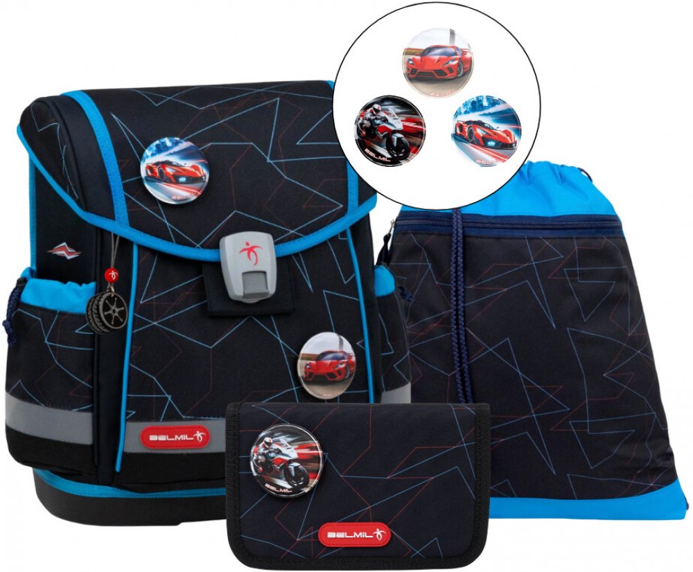 Belmil Classy Plus Cars Blue – parádní školní aktovka pro malé závodníky!Tento model z oblíbené řady Classy Plus potěší všechny kluky, kteří milují auta, rychlost a styl. Aktovka v kombinaci modré a černé barvy je nejen krásná, ale i lehounká (1050 g), ergonomická a plná chytrých detailů, které usnadní každý školní den.