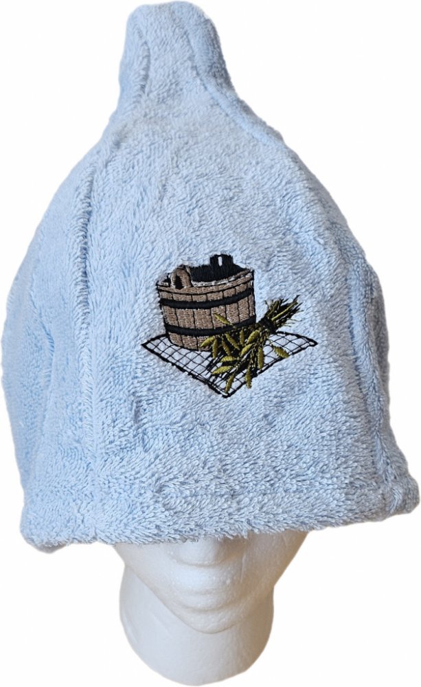 Dětský klobouk do sauny ve světle modré barvě je vyroben ze 100% bavlny. Tematická výšivka na čele.