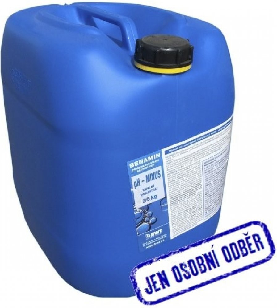 Vše na bazény koupíte v e-shopu Bazenonline.cz! Široký sortiment, výborné ceny, rychlé dodání. BWT Benamin pH mínus do bazénu 35 kg - Doprava zdarmaTekutá bazénová chemie Benamin pro snížení pH vody vhodná pro automatické dávkovače bazénové chemie. Ideální hodnota pH v bazénu je 6,8 - 7,4. Toto rozmezí vám zajistí správnou účinnost další bazénové chemie (multifunkčních tablet, tekutého chloru, bez...