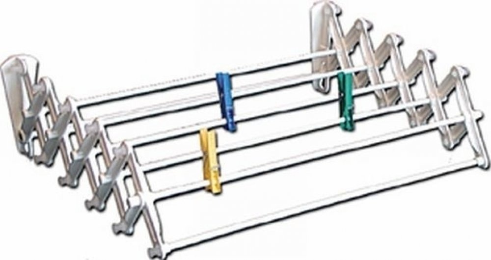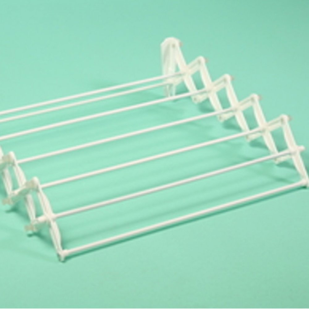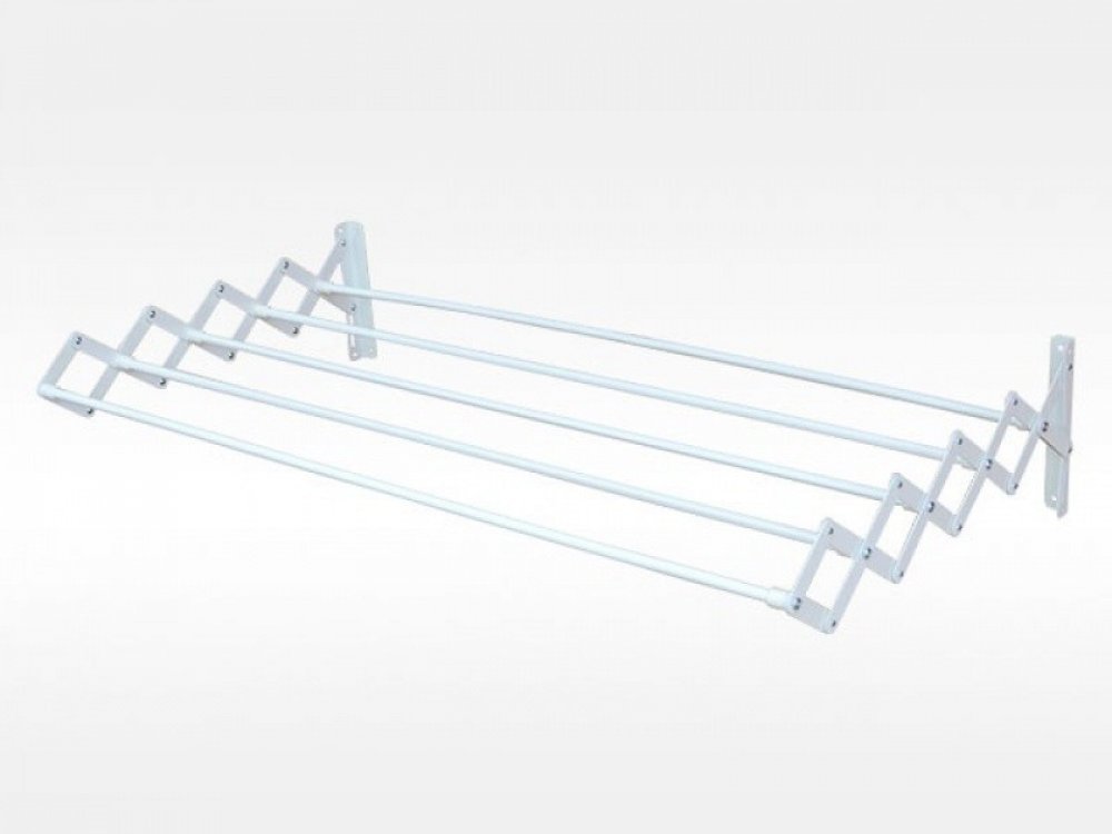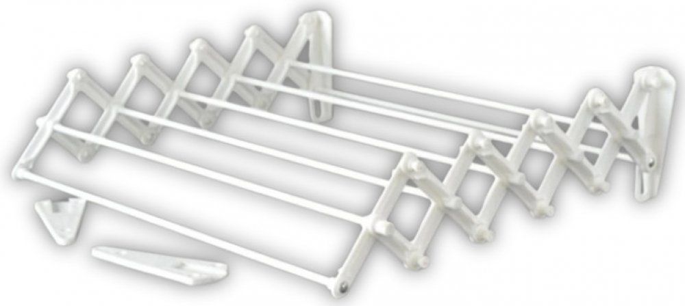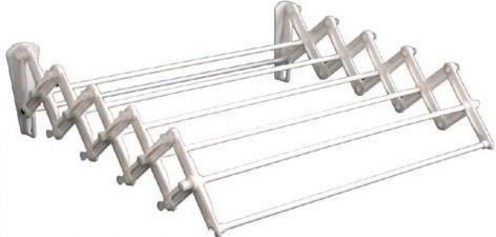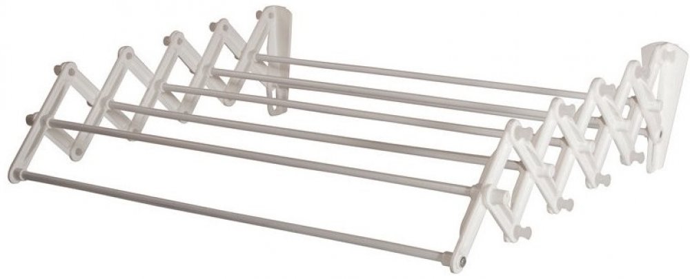 Harmonikový sušák na drobné prádlo pro upevnění na zeď. 7 ocelových tyčí potažených plastem.