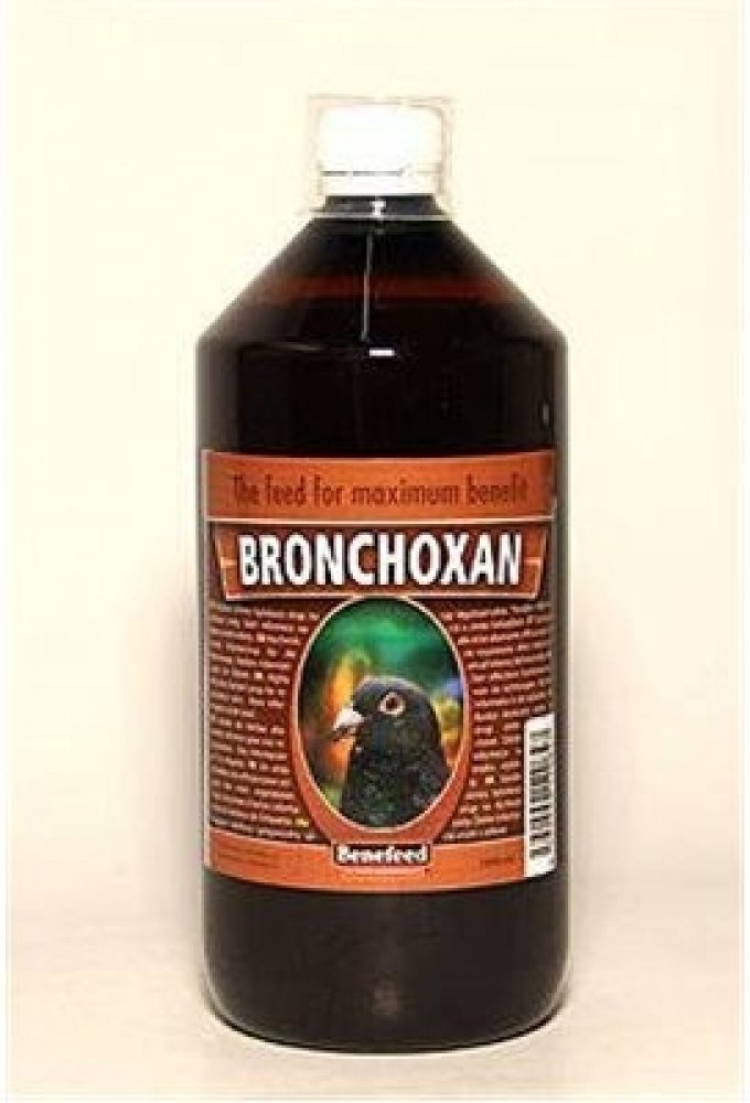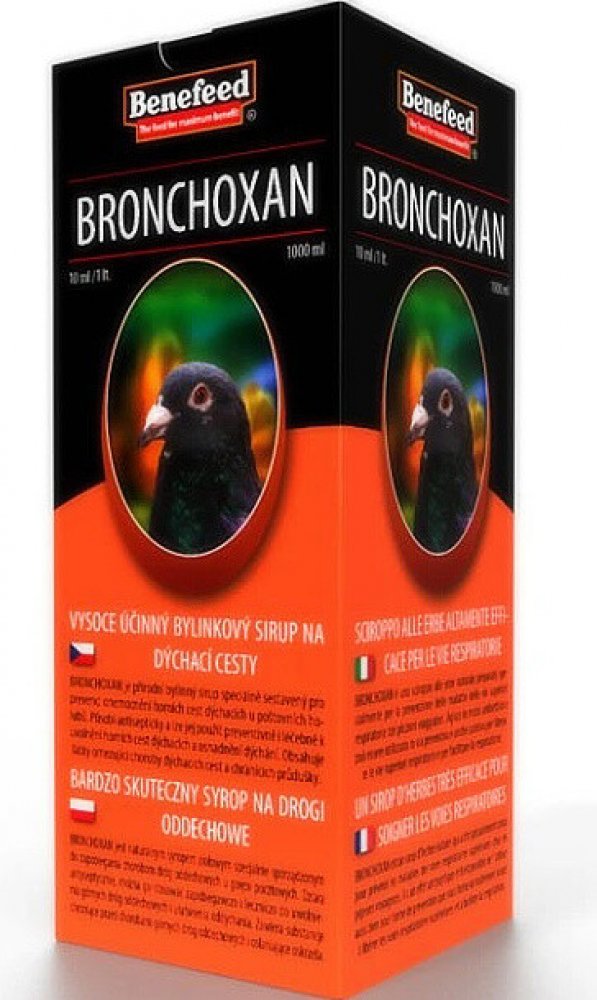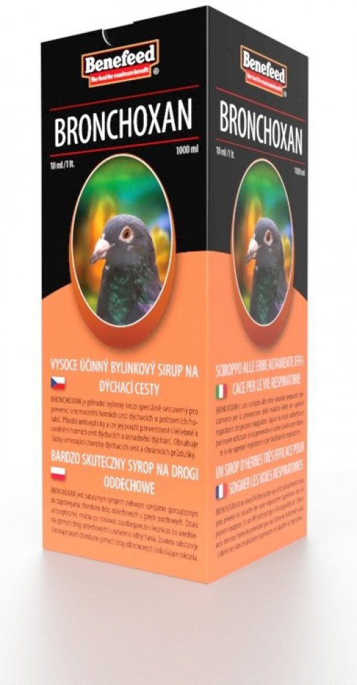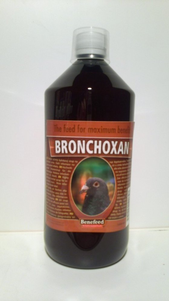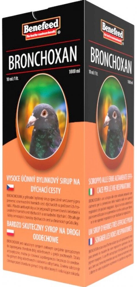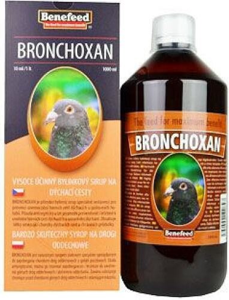 BRONCHOXAN je přírodní bylinný sirup speciálně sestavený pro prevenci onemocnění horních cest dýchacích u poštovních holubů. Působí antisepticky a lze jej použít preventivně i léčebně k uvolnění horních cest dýchacích a usnadnění dýchání. Obsahuje látky omezující choroby dýchacích cest a chránících průdušky. Významně omezuje záněty dýchacích cest a napomáhá jejich pročištění. V případě zánětu rozpouští hleny a usnadňuje vyměšování sekretu.