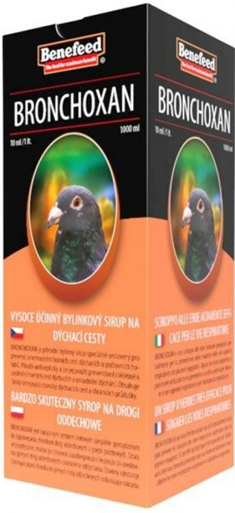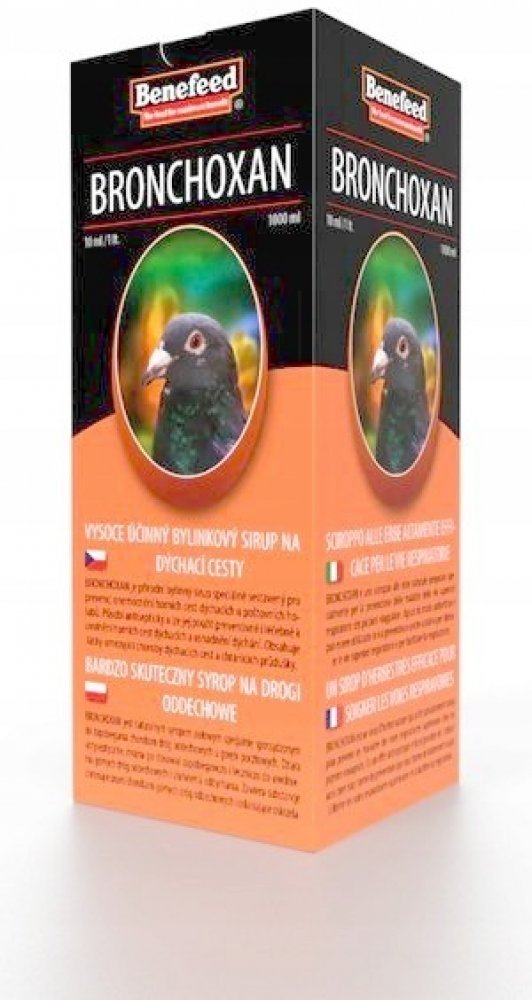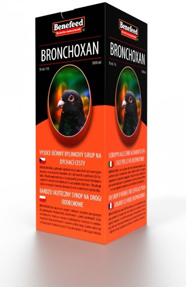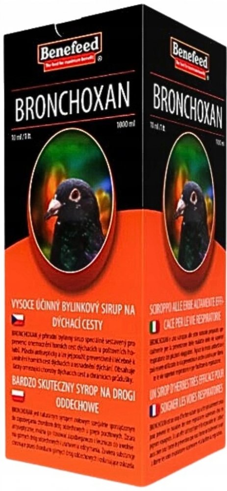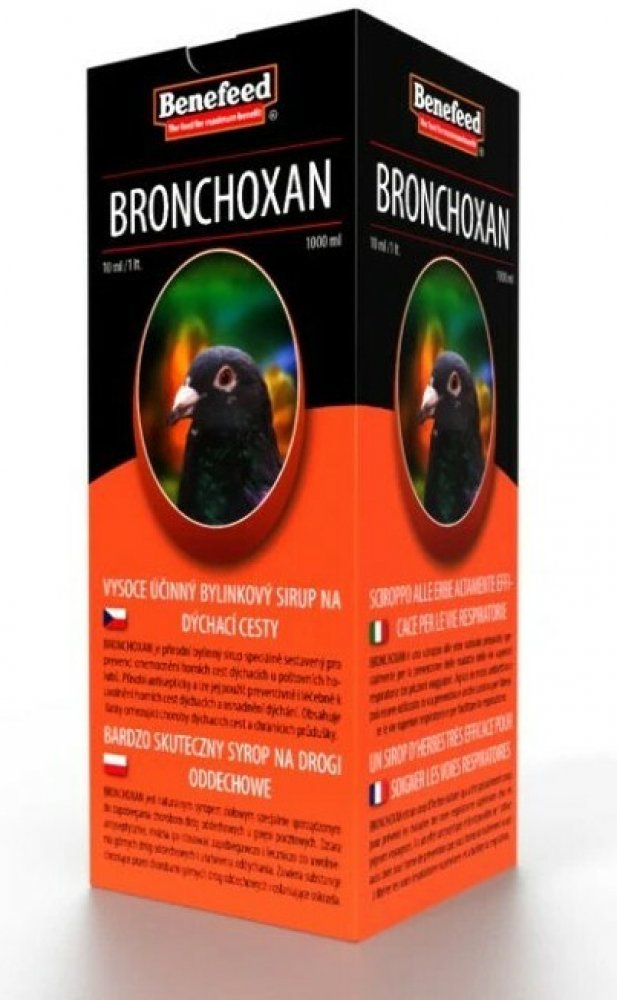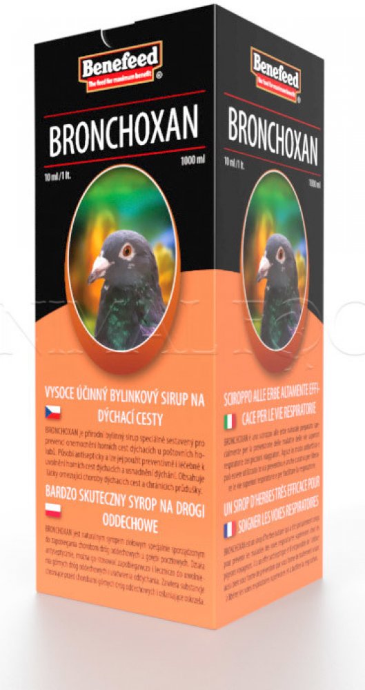 BRONCHOXAN je přírodní bylinný sirup speciálně sestavený pro prevenci onemocnění horních cest dýchacích u poštovních holubů. Působí antisepticky a lze jej použít preventivně i léčebně k uvolnění horních cest dýchacích a usnadnění dýchání. Obsahuje látky omezující choroby dýchacích cest a chránících průdušky. Významně omezuje záněty dýchacích cest a napomáhá jejich pročištění. V případě zánětu rozpouští hleny a usnadňuje vyměšování sekretu.