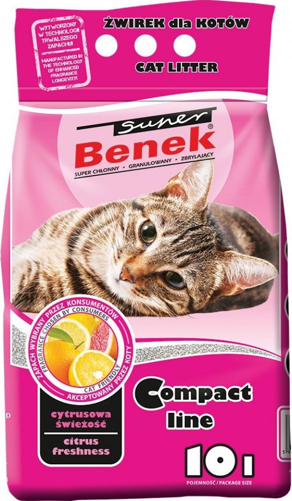 Podestýlka pro kočky od Super Benek je vyrobená z přírodního betonitu. Jednotná, jemná zrna s průměrem od 0,5 - 2 mm. Stelivo učinně obsarbuje tekutiny a zápachy a poskytuje dobrou antimikrobiální ochranu. Díky silné sací síle tvoří stelivo převážně kompaktní hrudky, které se neusazují na dně toalety. Díky suché a teplé konzistenci, vůni a přírodnímu povrchu jako je písek a zemina a bezprašným vlastnostem je podestýlka Super Benek Compact ideální do hygienických kočičích toalet. Stelivo Benek Super Compact v přehledu: hrudkující betonitová podestýlka jemná zrna 0,5 - 2 mm: pro vysoký výnos a jemné tlapky antibakteriální: vysoká absorpce tekutin a pachů silná sací síla: tvoří hrudky s malým obsahem okamžitě absorbuje pachy: nepříjemné pachy jsou okamžitě pohlcené přírodní konzistence a přírodní vůně bezprašné Způsob použití bentonitových podestýlek: Do kočičí toalety nasypte vrstvu 3-5 cm rovnoměrně na celém povrchu toalety, a v případě jiných mazlíků v kleci nasypte vhodný kopeček. Vyměňujte (odstraňujte) pouze opotřebenou (zhrudkovanou) část steliva, případně doplňte chybějící množství. Po důkladném čištění toalety neopotřebené stelivo znovu nasypte do toalety.