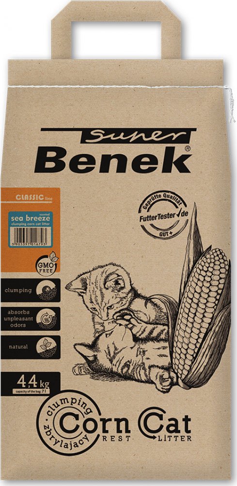 Benek Super Corn Cat mořský vánek je inovativní stelivo pro kočky, které je 100% přírodní, vyrobené z rostlinného materiálu. Nebyly přidány žádné chemické látky, proto je toto stelivo kompostovatelné a biologicky rozložitelné a můžete jej snadno zlikvidovat v kanalizaci domácí toalety. Stelivo je enormně savé, proto je kapalina rychle vstřebávána a tvoří kompaktní, ploché hrudky. To umožňuje snadné a komfortní čištění kočičího záchodu. Stelivo se zároveň vyznačuje obzvláště efektivní neutralizací zápachu, pachy jsou rychle absorbovány a perfektně zadrženy. Příjemná vůně mořského vánku zajišťuje příjemné vnitřní klima a rozvíjí se při kontaktu s kapalinami. Díky přírodní vůni bývá kočkami toto stelivo velmi dobře přijímáno. Díky jeho vlastnostem se stelivo méně roznáší mimo kočičí toaletu. Charakteristika produktu ve zkratce: Přírodní, hrudkující stelivo pro kočky a drobná zvířata Ze 100% přírodního, rostlinného materiálu: kompostovatelné a biologicky odbouratelné Likvidace do domácí toalety: hrudky se v záchodu rozpouští jako toaletní papír Vysoce absorpční: kapaliny se vstřebávají okamžitě a tvoří kompaktní hrudky Efektivní neutralizace zápachu: nepříjemné pachy budou perfektně odstraněny stelivem S vůní mořského vánku: pro příjemné vnitřní klima Velmi dobře snášené kočkami Díky vlastnostem steliva se snižuje jeho roznášení mimo toaletu