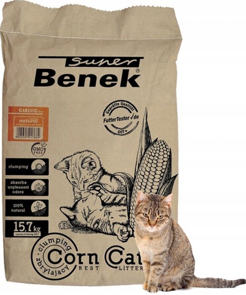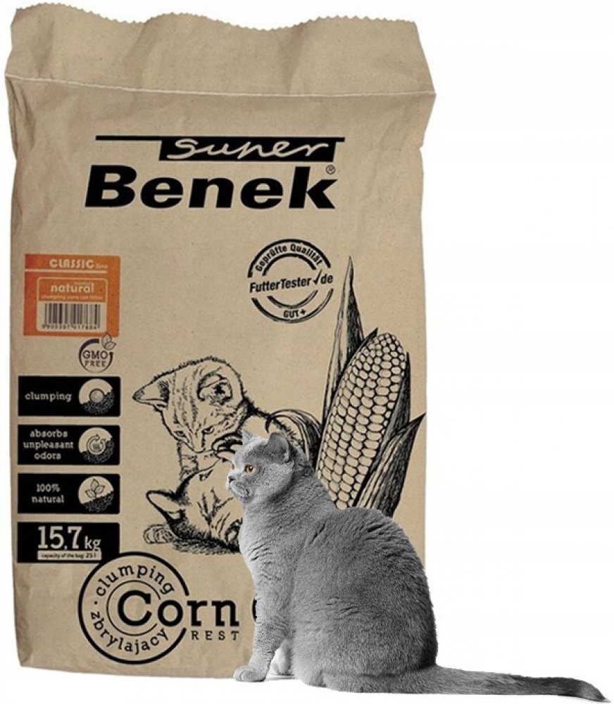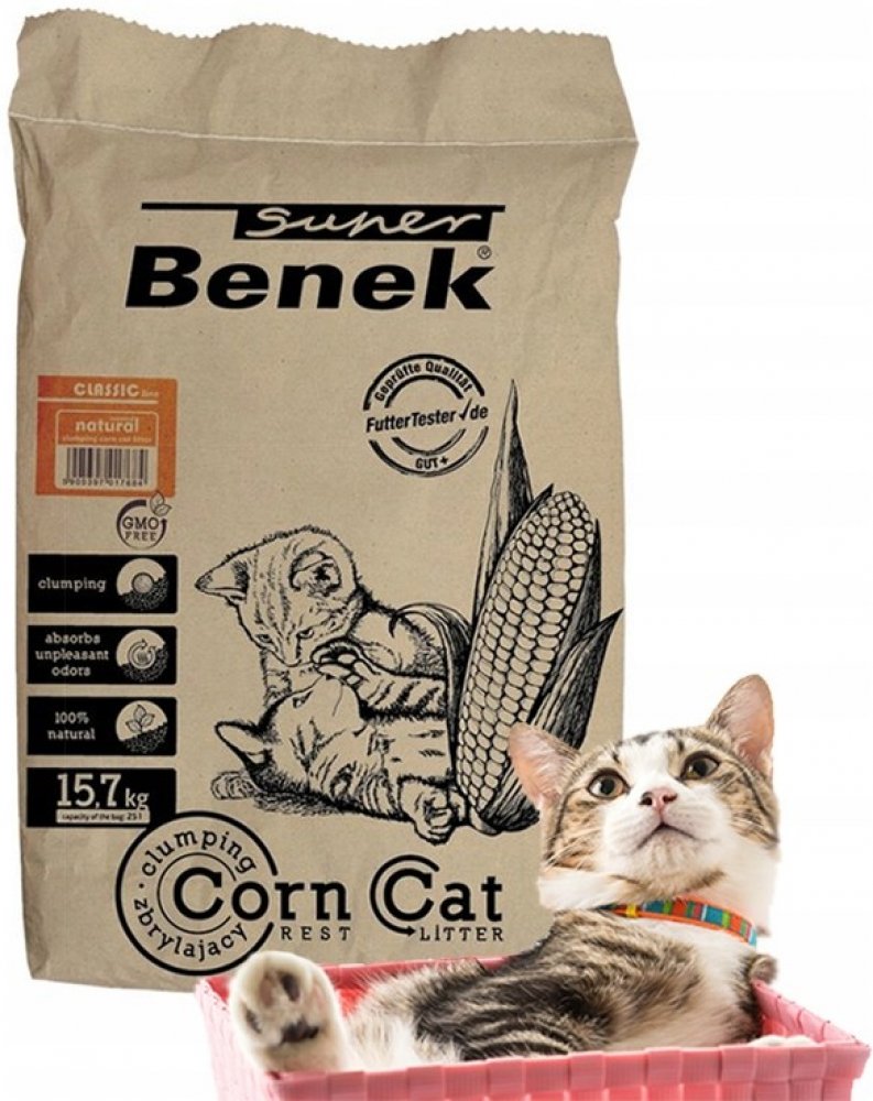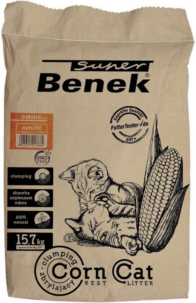 Upozornění: Vzhledem ke změně designu balení můžeVvaše objednávka obsahovat výrobek v předchozím i novém balení. Hrudkující stelivo Benek Super Corn Natural je vyrobeno ze 100% přírodních rostlinných složek a v jeho složení nejsou zahrnuty syntetické látky. Lze jej tedy snadno ekologicky zlikvidovat, ať už v toaletě, v kompostu či jinak. Velmi dobře saje a tvoří pevné hrudky. Stelivo nevykazuje žá...