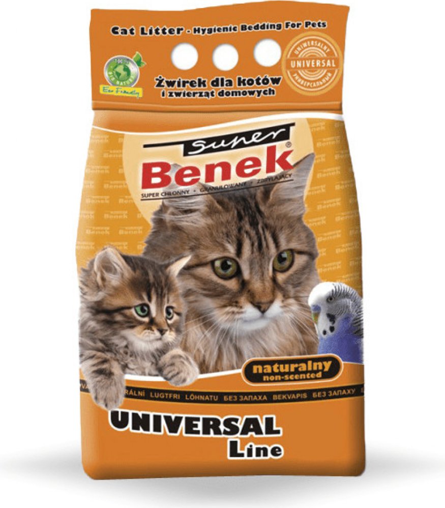 Benek Universal je hygienická podestýlka pro domácí zvířata vyrobená z bentonitové hlíny metodou expanze — s pravidelnými 2-5 mm zrnky hnědé barvy.