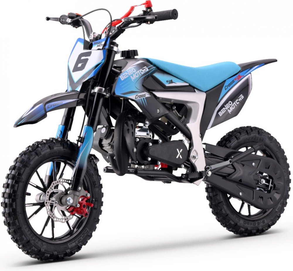 Beneo Motors CROSS SX 50 cm3 Věková hranice: od 4 let VÝKON: 1,5 kW Představujeme Beneo Motors CROSS SX – výkonný a snadno ovladatelný motocross, který je ideálním vozidlem pro každého, kdo touží po dobrodružstvích mimo asfaltové cesty. Cross SX je vynikající model s výkonem, který je ideální pro mladé jezdce, kteří ještě nemají zkušenosti, ale jsou připraveni osvojit si nové jízdní dovednosti a zažít vzrušení z jízdy v terénu. Lehký, snadno manévrovatelný a velmi kompaktní, CROSS SX je ideální pro děti ve věku od 4 do 8 let. Ideální pro bezpečný začátek jízdy na motocyklu. Tento model je dokonalý pro začátečníky. Je vybaven omezovačem rychlosti akcelerace, předními a zadními kotoučovými brzdami, krytem výfuku a ochranou řetězu. Vysoká výbava činí tento model ideálním pro rodiče, kteří chtějí sledovat pokrok svých dětí v bezpečných podmínkách. Je vybaven 50cc 2-taktním motorem s automatickou převodovkou a nejnovějším systémem EASY START se zesíleným hliníkovým startérem. Akcelerátor plynu lze nastavit na 3 různé polohy, což umožňuje snížit akceleraci motocyklu. Upozornění:Systém Easy Start na vašem motocyklu obsahuje mechanismus, který násobí sílu uživatele, což umožňuje snadné nastartování motoru bez vynaložení velké síly. Použitím správné palivové směsi (benzín 98 + 3% motorového oleje, podle doporučení výrobce) se vozidlo nastartuje jednoduchým zatažením rukou směrem k hrudníku. Životnost startéru a jeho správná funkce závisí na správném používání. Máte problémy se startováním? Neváhejte kontaktovat náš zákaznický servis a my vám rádi pomůžeme. Tento model je ideální zejména pro méně zkušené jezdce. Přesto je výkonný a stylový, což zaručuje dětem nezapomenutelný zážitek z jízdy v terénu.