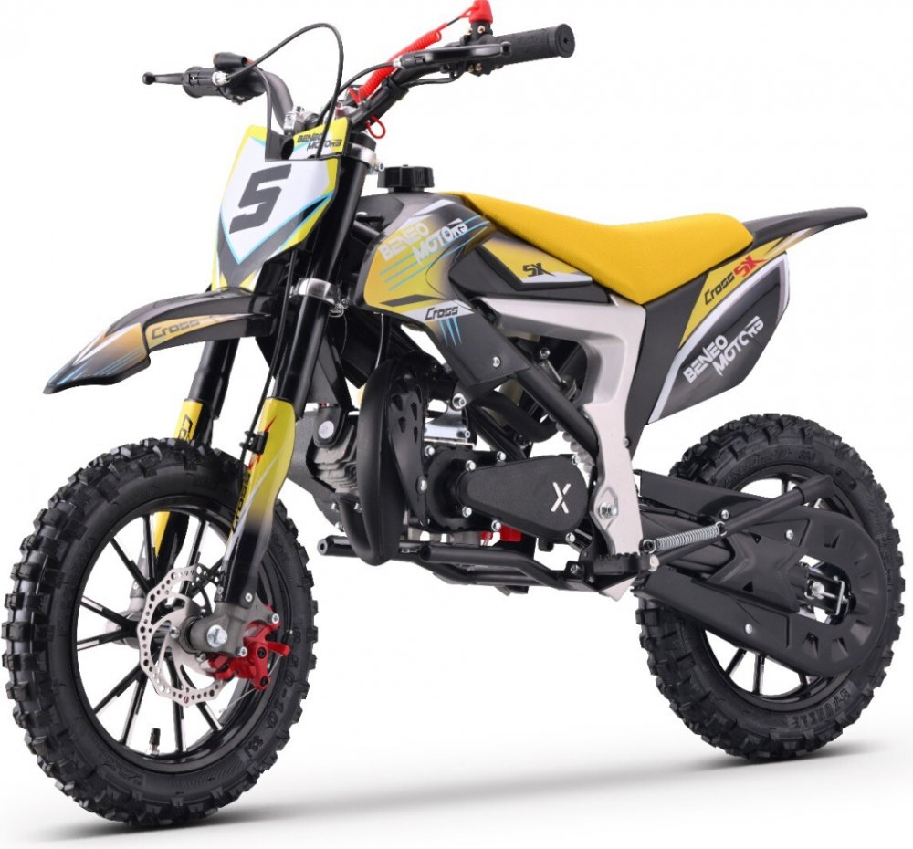 Beneo Motors CROSS SX 50 cm3 Věková hranice: od 4 let VÝKON: 1,5 kW Představujeme Beneo Motors CROSS SX – výkonný a snadno ovladatelný motocross, který je ideálním vozidlem pro každého, kdo touží po dobrodružstvích mimo asfaltové cesty. Cross SX je vynikající model s výkonem, který je ideální pro mladé jezdce, kteří ještě nemají zkušenosti, ale jsou připraveni osvojit si nové jízdní dovednosti a zažít vzrušení z jízdy v terénu. Lehký, snadno manévrovatelný a velmi kompaktní, CROSS SX je ideální pro děti ve věku od 4 do 8 let. Ideální pro bezpečný začátek jízdy na motocyklu. Tento model je dokonalý pro začátečníky. Je vybaven omezovačem rychlosti akcelerace, předními a zadními kotoučovými brzdami, krytem výfuku a ochranou řetězu. Vysoká výbava činí tento model ideálním pro rodiče, kteří chtějí sledovat pokrok svých dětí v bezpečných podmínkách. Je vybaven 50cc 2-taktním motorem s automatickou převodovkou a nejnovějším systémem EASY START se zesíleným hliníkovým startérem. Akcelerátor plynu lze nastavit na 3 různé polohy, což umožňuje snížit akceleraci motocyklu. Upozornění:Systém Easy Start na vašem motocyklu obsahuje mechanismus, který násobí sílu uživatele, což umožňuje snadné nastartování motoru bez vynaložení velké síly. Použitím správné palivové směsi (benzín 98 + 3% motorového oleje, podle doporučení výrobce) se vozidlo nastartuje jednoduchým zatažením rukou směrem k hrudníku. Životnost startéru a jeho správná funkce závisí na správném používání. Máte problémy se startováním? Neváhejte kontaktovat náš zákaznický servis a my vám rádi pomůžeme. Tento model je ideální zejména pro méně zkušené jezdce. Přesto je výkonný a stylový, což zaručuje dětem nezapomenutelný zážitek z jízdy v terénu.