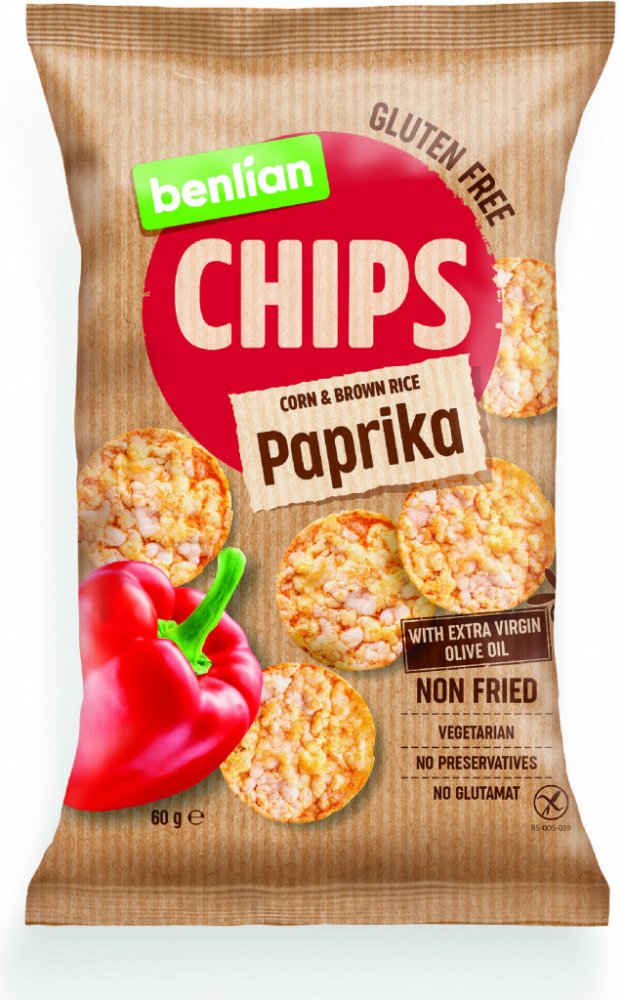 Benlian Rice Chips chipsy z kukuřice a hnědé rýže s příchutí papriky 60 g