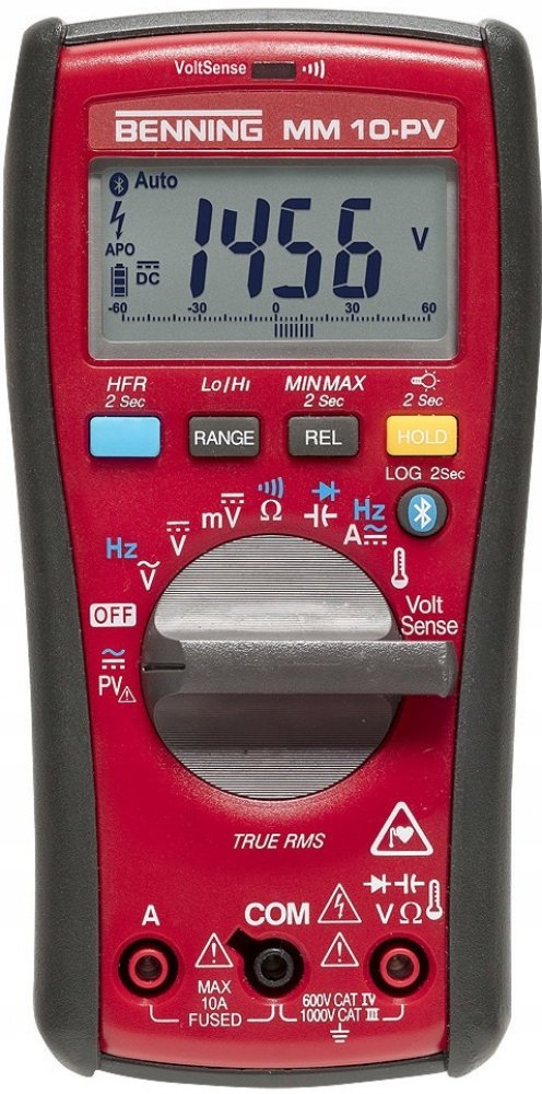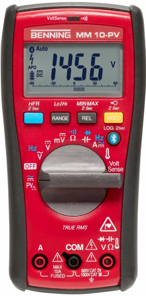 Digitální multimetr Benning MM 10-PV True RMS pro fotovoltaické systémy a pro průmysl, servis a obchod. Digitální displej. Analogové zobrazení sloupcového grafu ano. 4místný LCD displej (6000 bodů). Podsvícení LC displeje. Nejnižší rozlišení stejnosměrného napětí 100 mV. Max. Rozsah měření stejnosměrného napětí 2000 V. Nejnižší rozlišení střídavého napětí 100 mV. Max. Rozsah měření střídavého napětí 1500 V. Nejnižší rozlišení stejnosměrného proudu 1000 µA. Max. Rozsah měření stejnosměrného proudu 10 A. Nejmenší rozlišení střídavého proudu 1000 µA. Max. Rozsah měření střídavého proudu 10 A. Nejnižší rozlišení odporu 0,1 Ohm. Max. Rozsah měření odporu 40 MOhm. Nejnižší rozlišení kapacity 0,001 µF. Max. Rozsah měření kapacity 10000 µF. Nejnižší rozlišení frekvence 0,01 Hz. Max. Rozsah měření frekvence 100 kHz. Nejnižší rozlišení teploty 0,1 °C. Max. Rozsah měření teploty 400 °C. Měření teploty ano. Měření teploty -40 °C - +400 °C. Zkouška spojitosti/ zkouška diod ano. Zkouška spojitosti (< 20 ? - 200 ?)/ zkouška diod (1,5 V). Metoda měření True RMS ano True RMS. Funkce záznamu dat a paměti (4000 naměřených hodnot). Rozhraní Bluetooth® Low Energy 4.0 pro přenos naměřených hodnot. Bezplatná aplikace pro IOS a Android BENNING MM-CM Link pro stahování, ukládání a sdílení naměřených hodnot prostřednictvím chytrého telefonu/tabletu. Funkce AutoV pro automatickou detekci střídavého/stejnosměrného napětí. Nízká vstupní impedance (LoZ) pro potlačení kapacitních/induktivních prolínajících se napětí. Nízkofrekvenční filtr (potlačení vysokých frekvencí HFR, 800 Hz) pro měření na spínaných motorových pohonech. Snímač napětí pro bezkontaktní testování přerušení fáze a kabelu (červená LED). Automatická volba rozsahu měření. Automatické vypnutí. Automatické zobrazení podpětí baterie. Paměť okamžitých hodnot Data HOLD ano. Paměť naměřených hodnot ano. Paměť maximální hodnoty ano MAX. Paměť minimální hodnoty ano MIN. Měření relativní hodnoty ano REL. Kategorie měřicího obvodu CAT IV. Max. Kategorie měřicího obvodu napětí 600 V. Kategorie měřicího obvodu CAT III. max. napětí Kategorie měřicího obvodu napětí 1000 V. Obsahuje měřicí adaptér BENNING TA PV, sadu měřicích vodičů/krokolemových svorek, sáček, drátové teplotní čidlo, 2 x 1,5 V baterie AA/LR6.