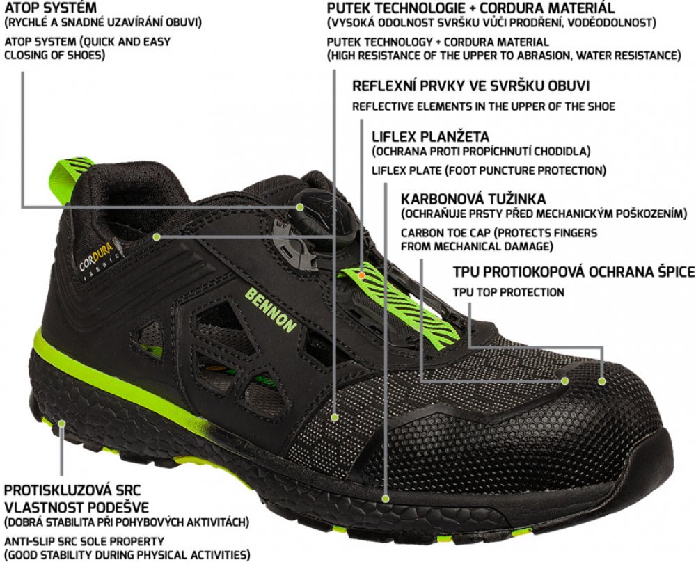 • Vysoká odolnost svršku vůči prodření je zajištěna pomocí inovativního materiálu PUTEK, jež se skládá z vysoce houževnatého polyesterového jádra a PU pláště, dále pak je použit i CORDURA materiál. Tyto dva materiály zvyšují životnost obuvi.
