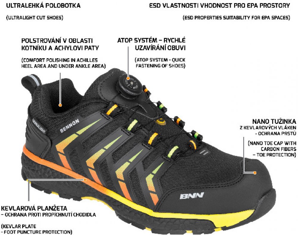 Odolná, pohodlná, ultralehká S3 obuv teniskového vzhledu s ESD vlastnostmi, která je vhodná do vnitřních, venkovních a také EPA prostorů.