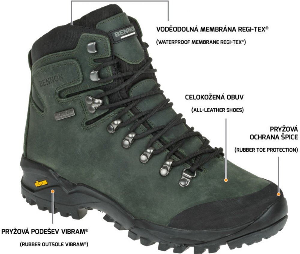Tento popis byl strojově přeložen z původního textu.Pouze pro nerovný terén v TERENNO Green High. Chystáte se na túru do hor a potřebujete mít jistotu, že si nevyvrtnete nohu? Potřebujete boty, na které se můžete spolehnout i v drsnějších podmínkách? TERENNO High je vyšší celokožená treková obuv, která velmi dobře fixuje nohu, takže noha má v botě dobrou stabilitu. Na nerovném, kamenitém povrchu přijde vhod celogumová podrážka Vibram®, která zajistí, že nepocítíte každou terénní nerovnost. A pokud náhodou zakopnete, přijde vhod ochrana prstů, aby se boty jen tak nepoškodily. Pokud se chystáte na celodenní trek, může se stát, že se počasí náhle změní k horšímu. Tehdy oceníte, že jsou boty vybaveny nepromokavou membránou REGI-TEX®. Membrána zajistí, že vaše nohy zůstanou v suchu, i když budete přecházet rozvodněný potok, louku nebo kaluž. Díky kvalitním komponentům a použitým materiálům jsou boty Terenna stabilní a odolné vůči nepříznivým klimatickým vlivům v terénu a lze je použít i na náročnější horské túry.