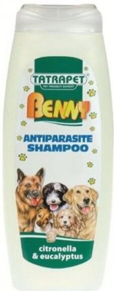 Benny šampon antipar. 200 ml Šampon pro psy Benny s repelentním a antibakteriálním účinkem obsahuje výtažky z citronely a éterické oleje z eukalyptu. Příjemná vůně těchto látek odpuzuje bodající a krev sající hmyz . Šampon rozřeďte ve vodě a nechte na psovi chvíli působit, následně opláchněte. Šampon Benny zjemňuje srst a dodává svěží, dlouho trvající vůni.