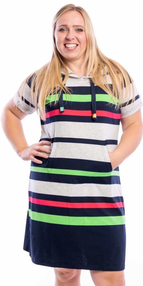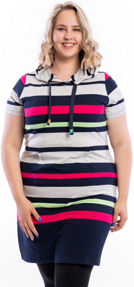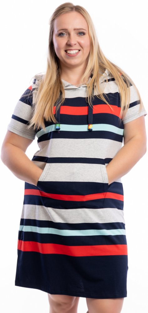 Hledáš pohodlné šaty vhodné pro běžné nošení? Pruhované šaty CASEY s kapucí jsou pružné šaty sportovního střihu s klokankovou kapsou. Kapuce má šňůrky na stahování. Materiál je příjemný na dotek a prodyšný. Vybírat můžeš z velikostí M, L, XL a 2XL. V nabídce najdeš 4 barevné kombinace.