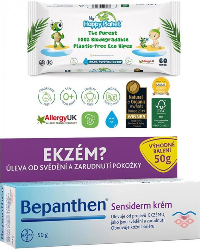 Bepanthen krém Sensiderm proti ekzému 50 g + ubrousky Happy Planet 100% BIO 60 ks dárková sada
