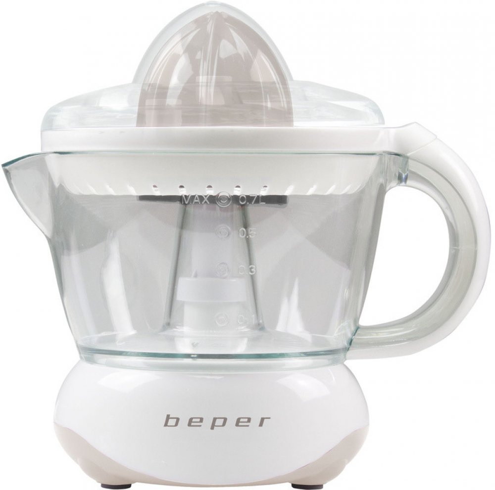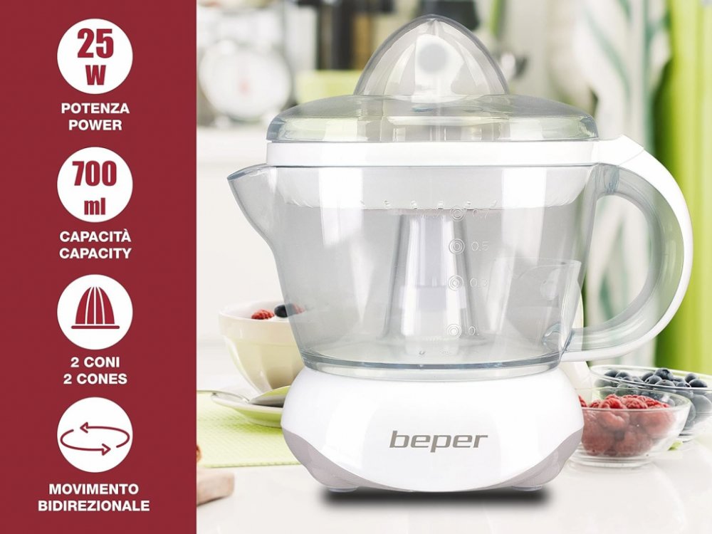 Kompaktní elektrický odšťavňovač s tělem z ABS, je vhodný pro malé i velké citrusové plody díky dvěma různým nástavcům.