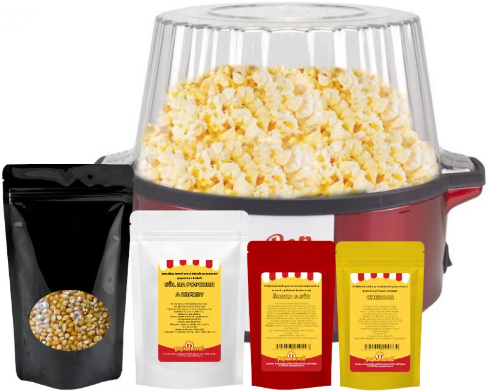 Zpříjemněte si pátek nebo večírek pomocí tohoto praktického popcornovače, který vám za pouhých 5 minut připraví až 75 gramů popcornu. Rotační čepel přístroje během vaření automaticky rovnoměrně rozdělí kukuřičná zrna s olejem nebo máslem. Poskytuje chutný a dobrý popcorn, na kterém si pochutná celá rodina nebo skupina přátel. Průhledné víko popkornovače je ideální jako miska pro servírování popcornu. Součástí dodávky je odměrka. - Stroj na popcorn pro celou rodinu - Připraví až 75 gramů popcornu za 5 minut - Víko přístroje slouží také jako miska Technické údaje Barva: červená Materiály: nerezová ocel, plast Rozměry: 22 cm Kapacita: 75 g Výkon: 700 W Zástrčka EU
