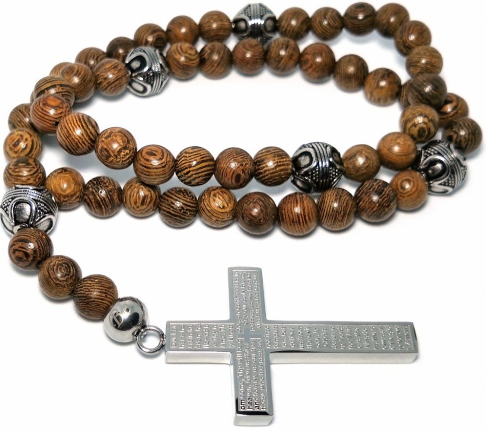 Modlitba Otčenáš - Our Father je embossována (vytlačena) na detailní kříž z chirurgické oceli ve stříbrné barvě. Jako růžence jsou na modlitební pomůcce použity plné korálky z chirurgické oceli v antické stříbrné úpravě.