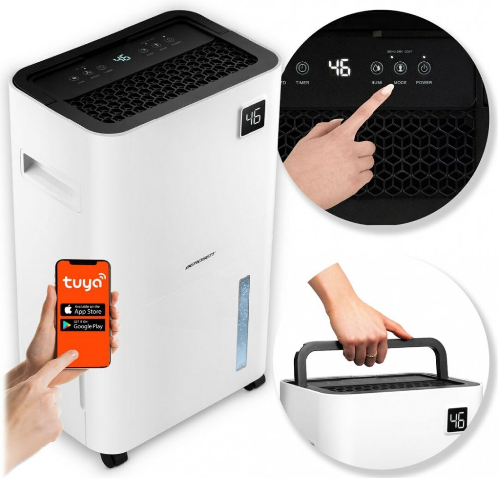 ODVLHČOVAČ VZDUCHU POHLCOVAČ VLHKOSTI 20L/24H HYGROSTAT WI-FI ČASOVAČ TUYA⭐⭐⭐⭐⭐ Výkonný kompresorový odvlhčovač s Wi-Fi 20 l/24 h✅ Aplikace Tuya ke stažení z Google Play a Apple Store usnadní dálkové ovládání odvlhčovače