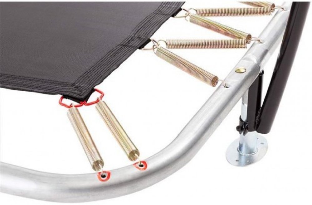 - Kvalita: vysoký počet silných pružin (o 30% pružin více ve srovnání se standardními trampolínami!) se díky novému postupu nasazuje při montáži mnohem snadněji (červené oko pružiny na červenou značku na rámu). Pružiny jsou navíc opatřeny velmi odolným zinkováním, které zajišťuje vynikající antikorozní vlastnosti.