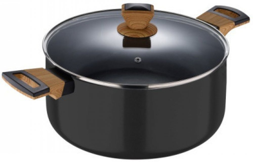 Hrnec 28 cm se skleněnou poklicí z kolekce Bergner's Earth Black je vyroben z lisovaného hliníku a zaručuje rychlý rozvod tepla. Prémiový nepřilnavý povlak ILAG je obzvláště odolný a vhodný pro každodenní použití. Vzhledem ke složení materiálu je při vaření v tomto kastrolu bez PFOA, olova nebo kadmia nutné použít pouze malé množství tuku, perfektní pro zdravé vaření. Ergonomická dřevěná rukojeť s měkkým úchopem a tepelně odolná proti popálení. Základna s indukčním bodem je vhodná pro všechny sporáky jako je indukční, plynový, sklokeramický, halogenový a elektrický. Snadno se čistí, na povrchu se nelepí potraviny a pro prodloužení životnosti výrobku se doporučuje ruční mytí.
