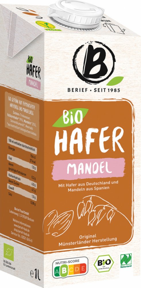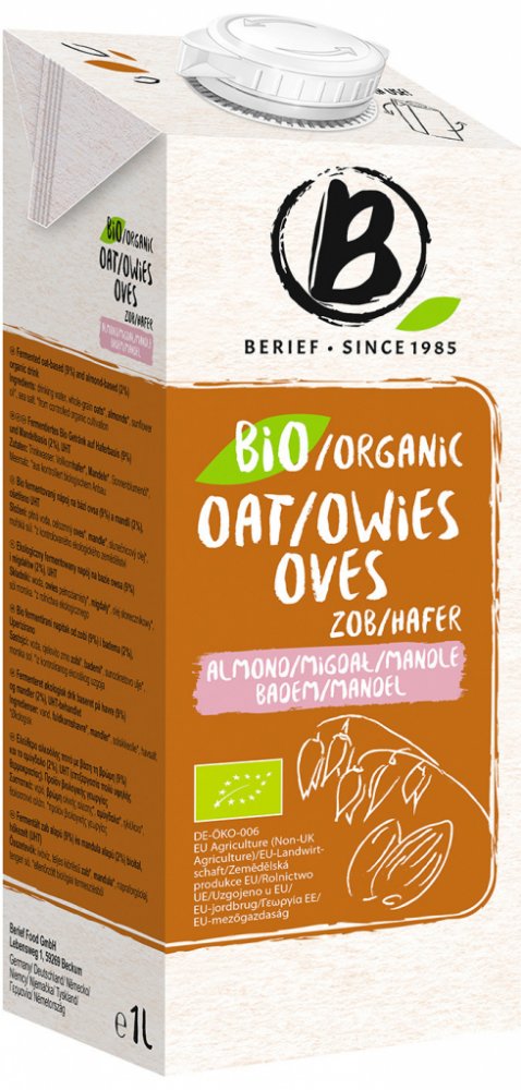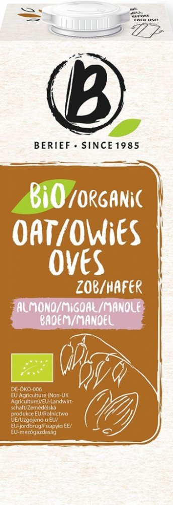 NÁZEV A SKLADOVÁNÍ: Ovesno-mandlový nápoj. Po otevření skladujte v ledničce a spotřebujte do 3 - 4 dní.