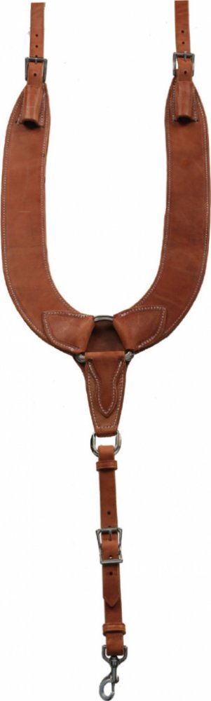 Westernový poprsník vyrobený z vysoce kvalitní kůže. Vybavený přezkami z nerezové oceli pro perfektní odolnost a stabilitu. Opatřený karabinou pro pohodlné připnutí k podbřišníku.
