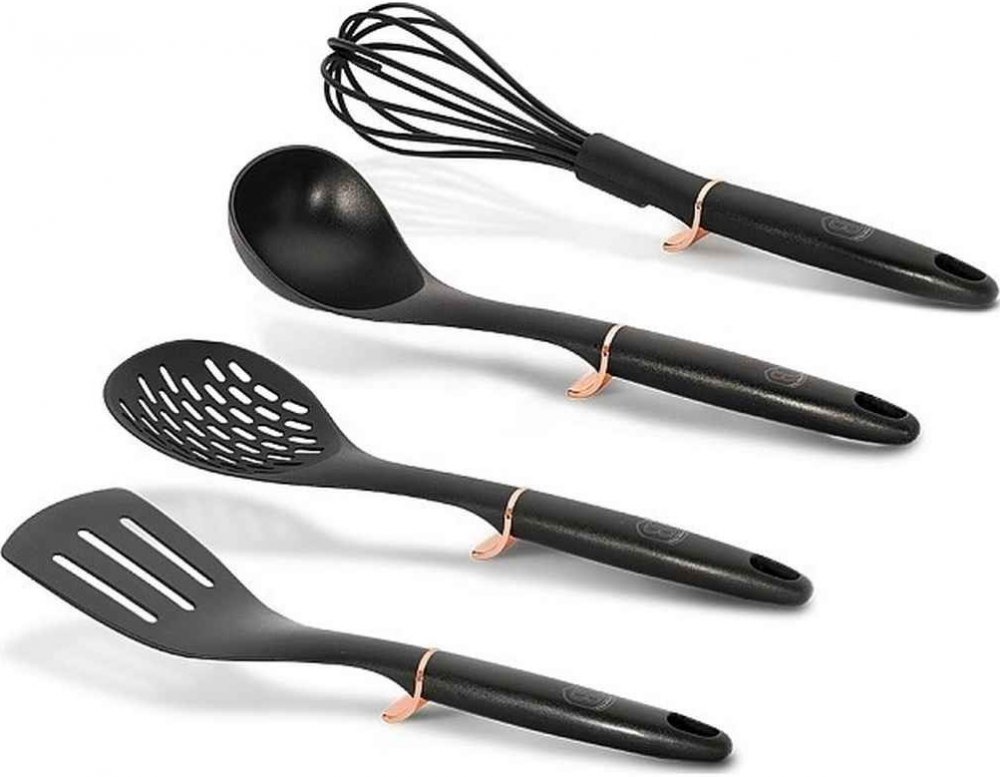 Berlingerhaus Kuchyňská náčiní sada 4 ks z kolekce Black Rose je skvělým přírůstkem do vaší moderní kuchyně. Každý kus náčiní je vyroben z nylonu, který je odolný a šetrný k vašemu nádobí. S praktickou nožičkou uprostřed, která udržuje hlavici ve vzduchu a chrání tak vaši kuchyňskou linku. Tato sada obsahuje obracečku, pěnovačku, naběračku a šlehací metlu, vše ve stejném designu a barvě z kolekce Black Rose. Díky očku na konci každého náčiní je lze snadno zavěsit. S touto sadou budete mít všechny potřebné nástroje na vaření pohromadě a navíc v luxusním provedení. Délka sady je 39,8 cm, šířka 36,0 cm a hloubka 9,0 cm. S touto sadou si užijete zážitek z vaření bez obav, že byste něco poškodili.